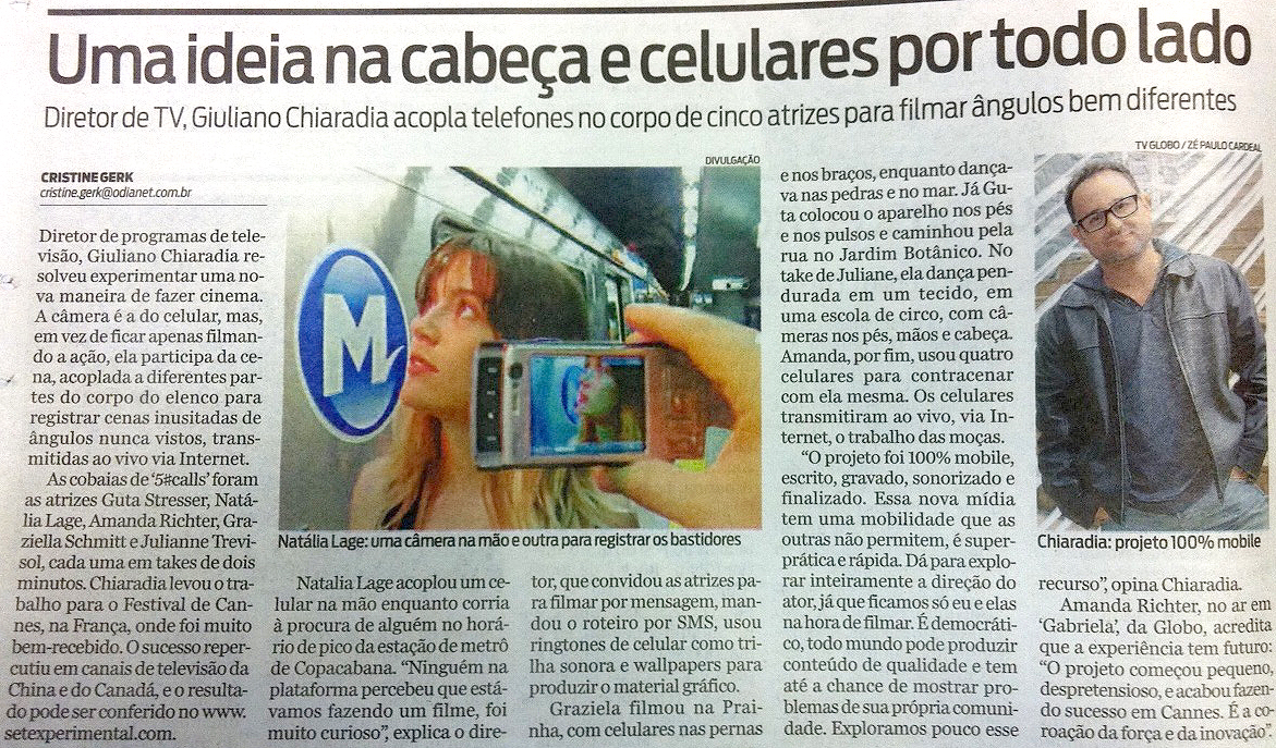 5 # The script was written by CALLS Chiaradia scenes than 180 characters sent via SMS to the cast (and so also was the invitation to participate in the film). The team came down to recording director – and your phone, of course. The images were recorded of the most unusual angles: Stringed instruments in the body of the actresses. Thus came up the path by Natalia Lage Copacabana subway in the rush hour, steps Guta Stresser with a phone in his All Star and Julianne Trevisol juggling, circus tissues by hanging. The recordings were broadcast live on the Internet by Qik.com site.