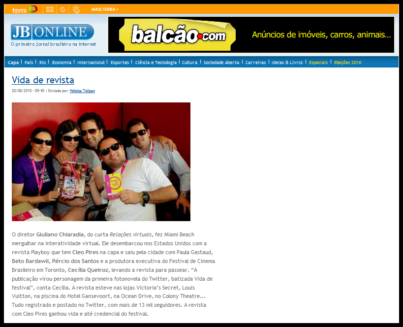 Criada e dirigida pelo diretor Giuliano Chiaradia, a fotonovela conta o glamour e os bastidores de um festival. Giuliano transformou uma revistaPlayboy – com a atriz Cléo Pires na capa – em um personagem, a Cléo e é ela quem interpreta todas as cenas do folhetim Vida de Festival.