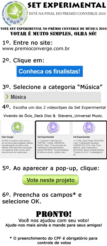 “SET EXPERIMENTAL” está na final do Prêmio Converge 2010 na categoria de > MÚSICA, com 02 VIDEOCLIPES!!!